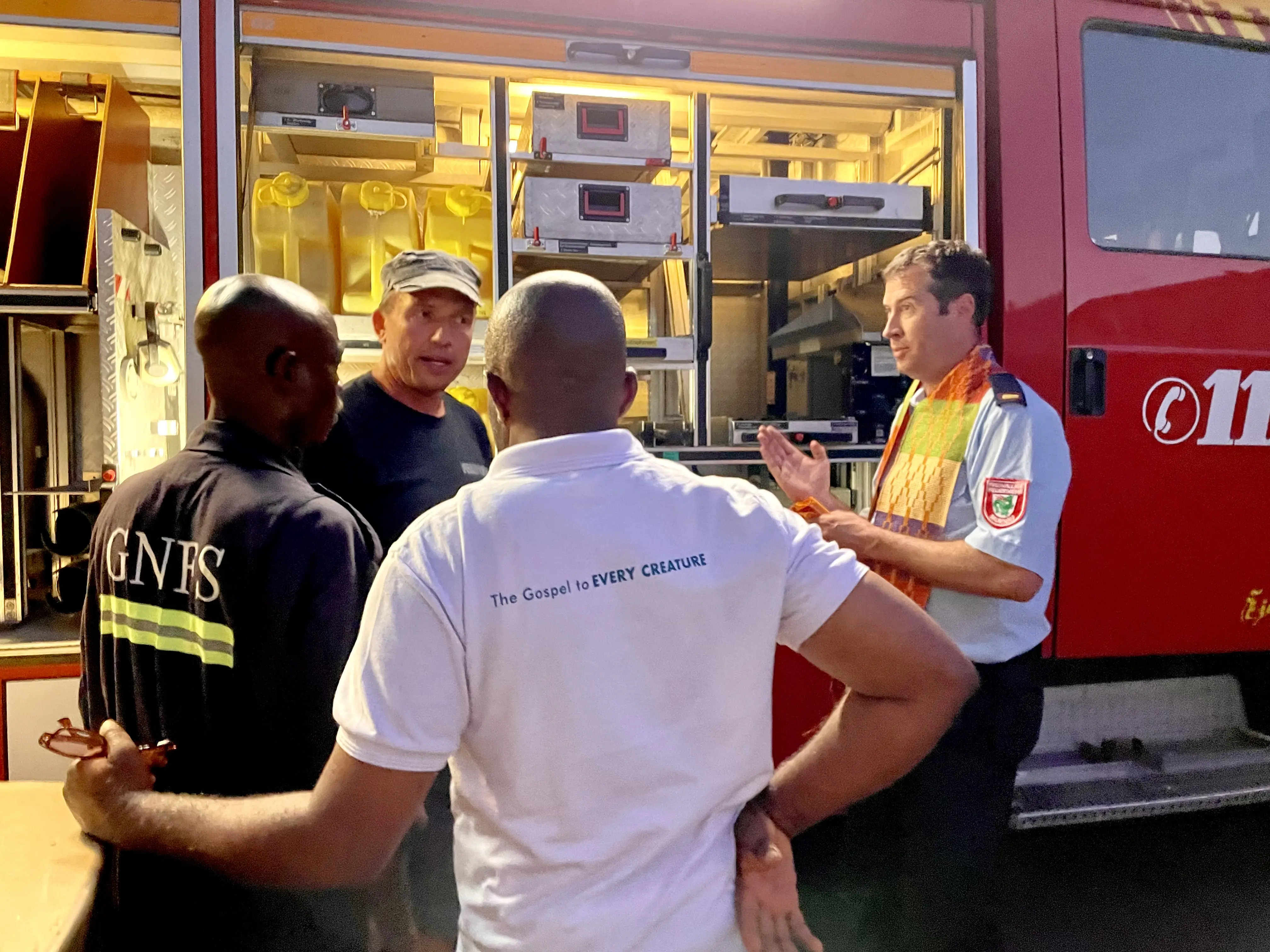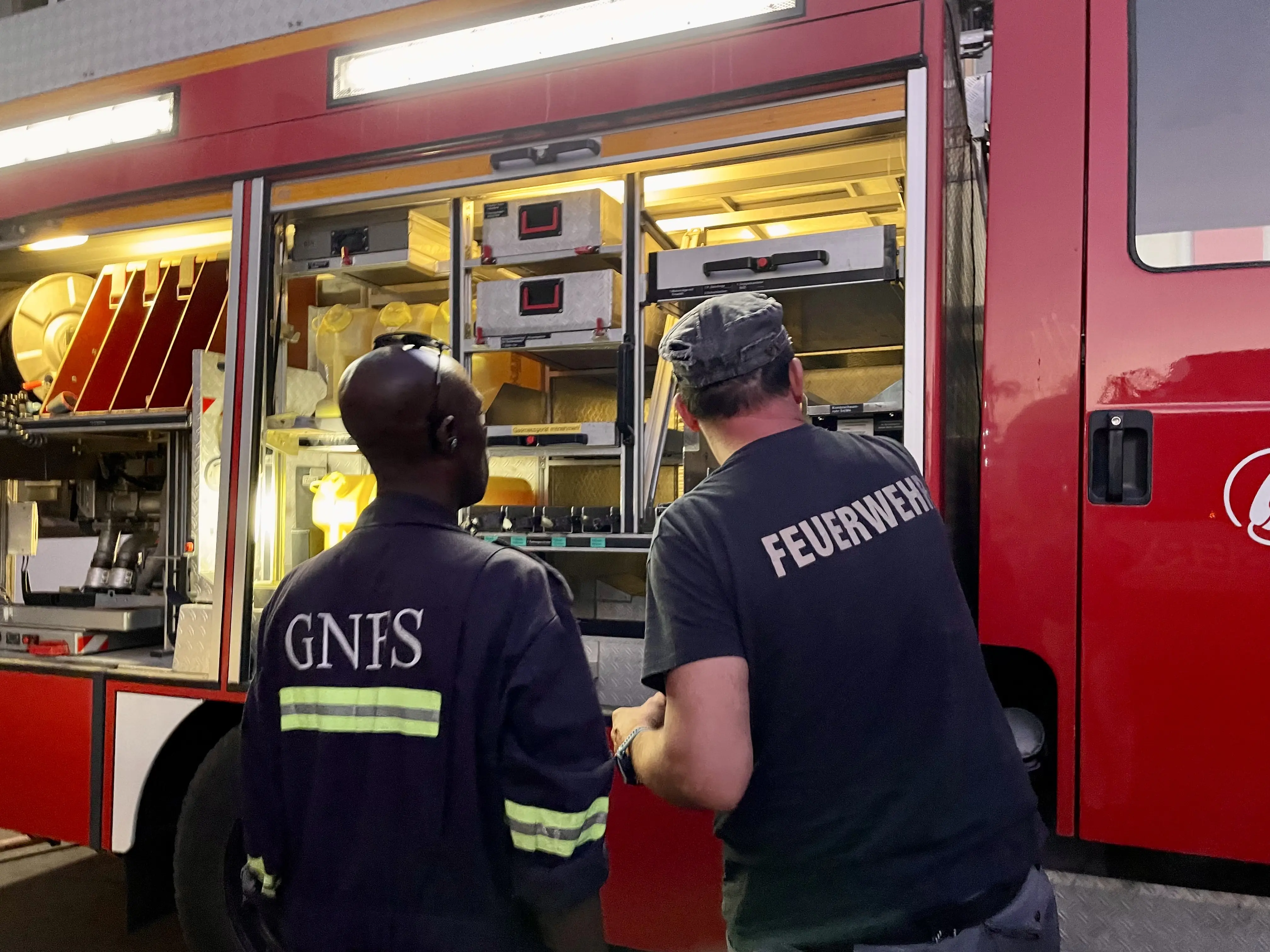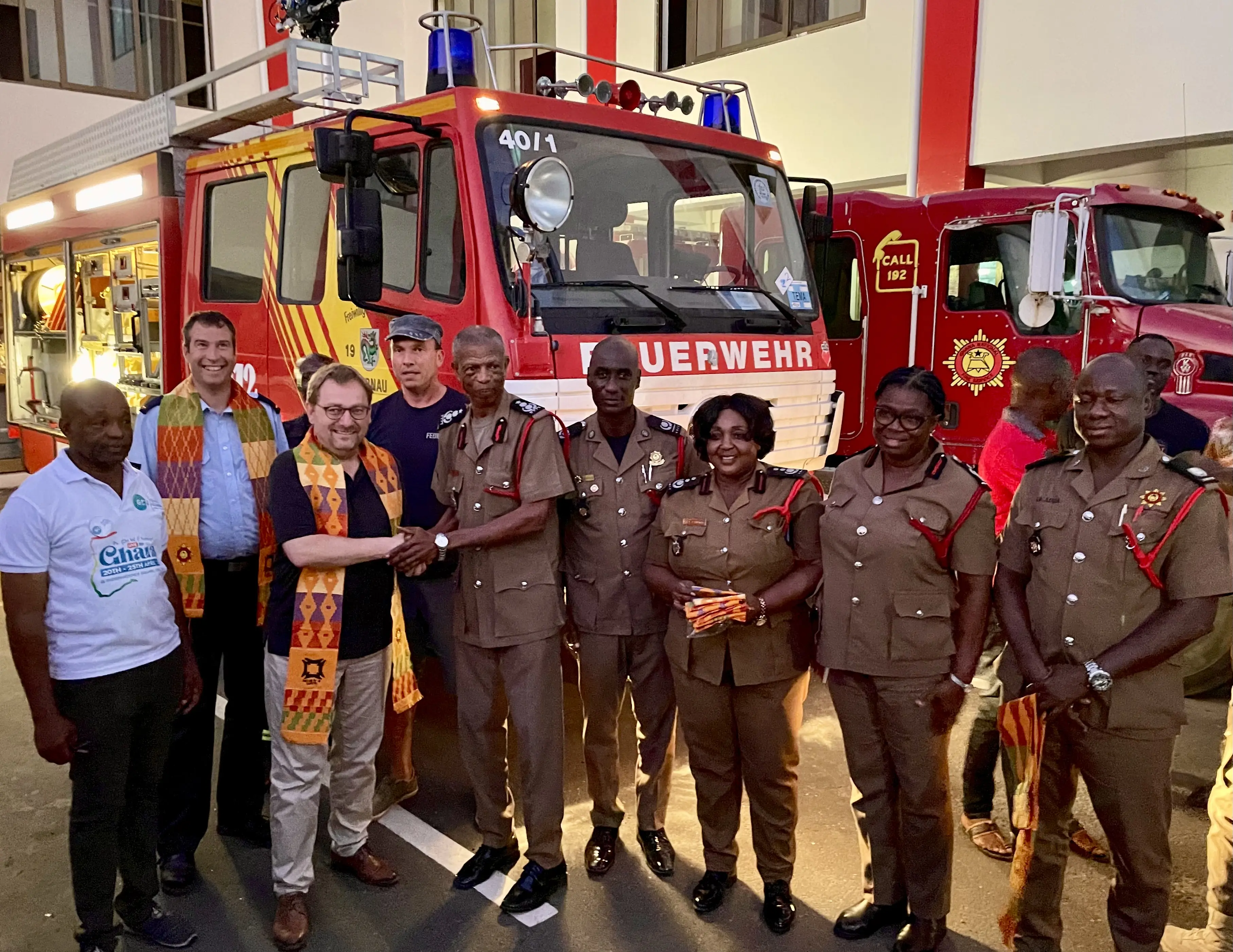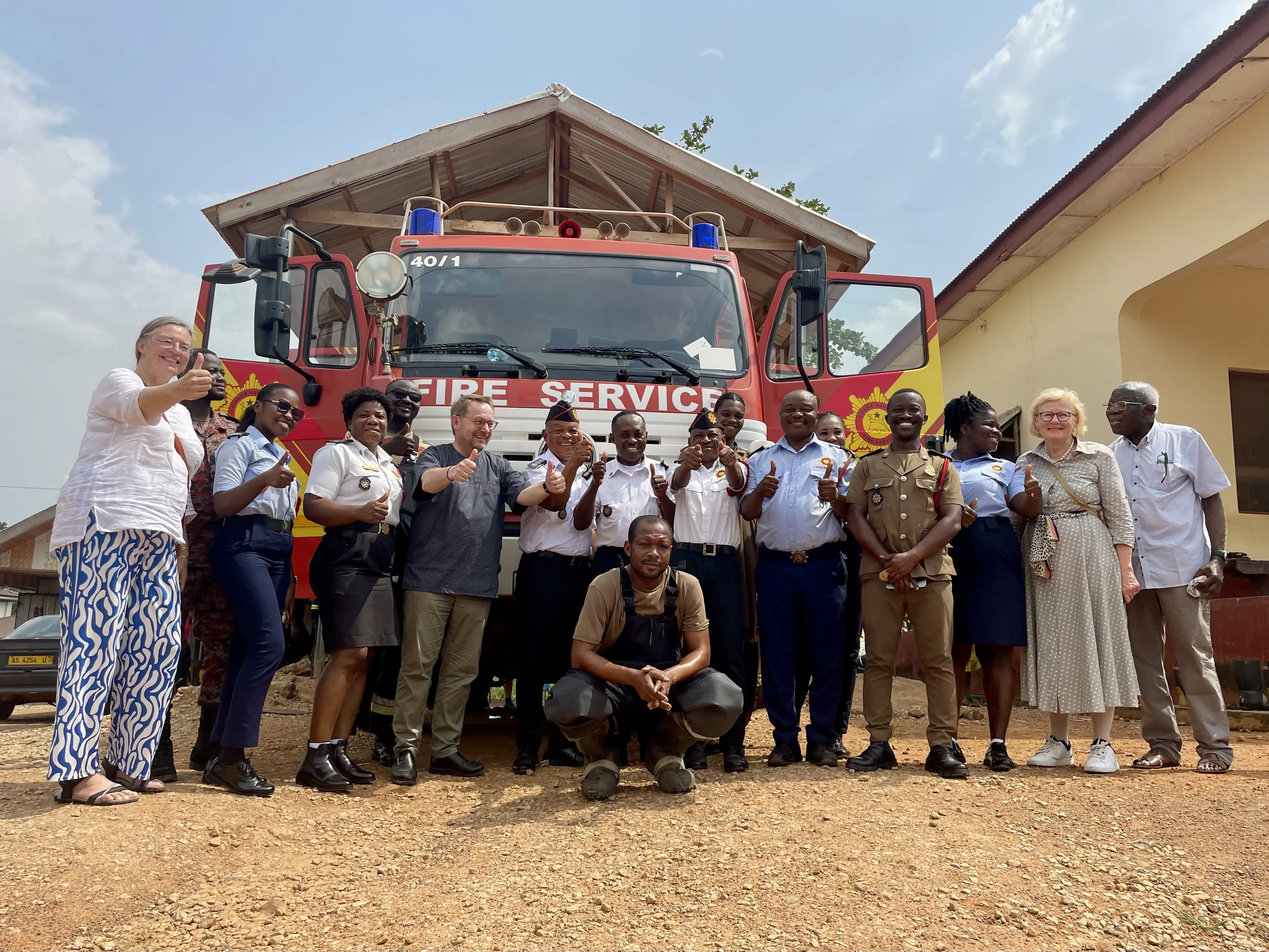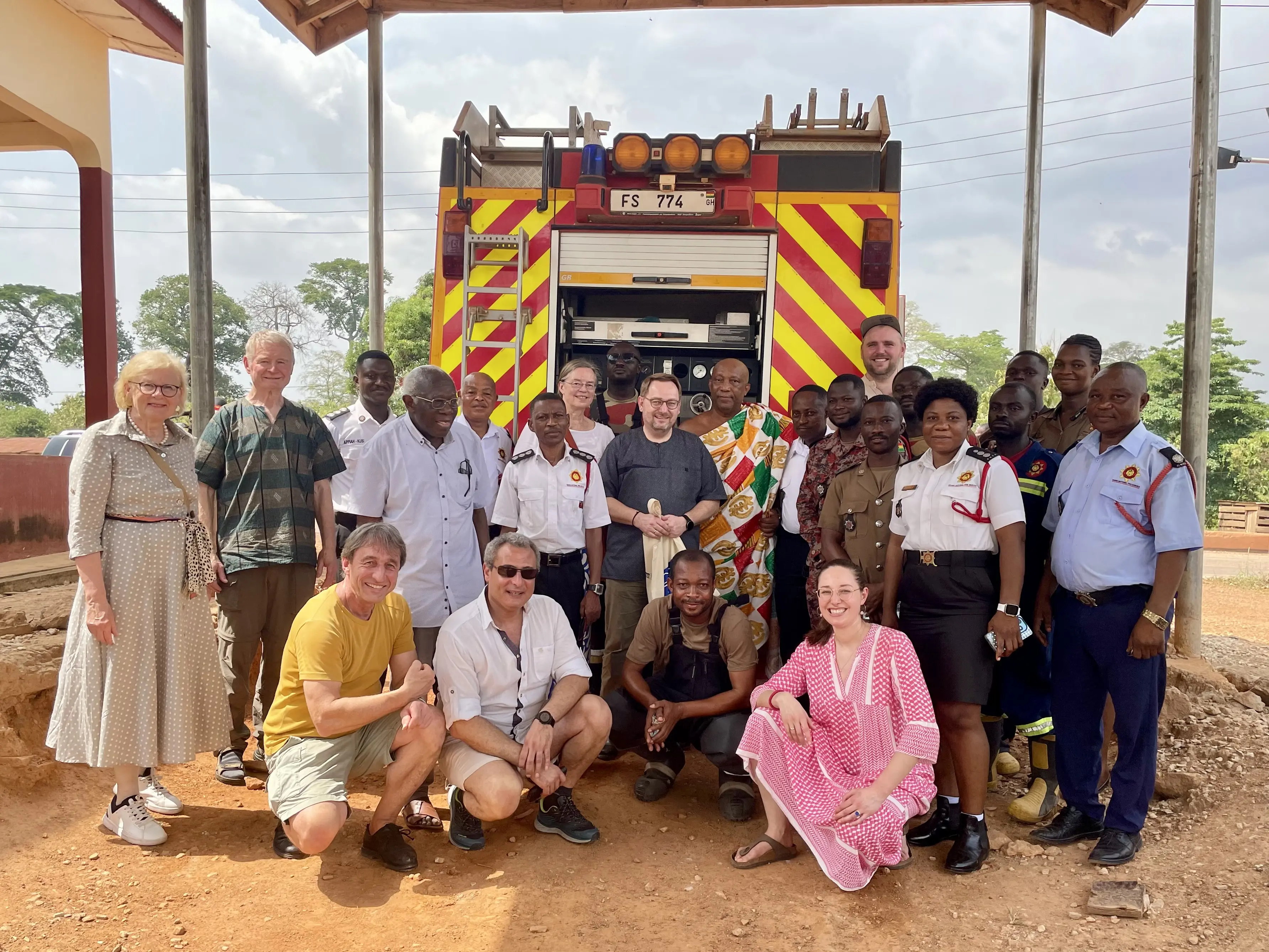 Das Fahrzeug wurde 2023 von Deutschland nach Ghana verschifft. Bei einer Delegationsreise im Frühjahr des Jahres schulten Mitglieder der Freiwilligen Feuerwehr Murnau ihre ghanaischen Kollegen in der Bedienung des Löschwagens. Seit Beginn der Partnerschaft 2019 herrscht ein reger und enger Fachaustausch der Feuerwehren, der bei jedem Delegationsbesuch, sei es in Murnau oder in Atwima, vertieft wird. Bei einem Besuch von Verwaltungsmitarbeitern aus Atwima in Murnau im Frühjahr 2024, berichtete Mayor Prince Karikari, der damalige Bürgermeister des Distrikts Atwima, welche positiven Auswirkungen und unschätzbare Dienste das Rettungsfahrzeug seit der Überführung im Jahr zuvor leiste. Nicht nur helfe es den 250.000 Einwohnern bei Bränden, sondern unterstütze die Bevölkerung auch bei Unfällen, Noteinsätzen und anderen prekären Situationen. Als wir Anfang des Jahres 2025 als Murnauer Delegation wieder nach Ghana reisten, konnten wir auch die neue Feuerwache besuchen.